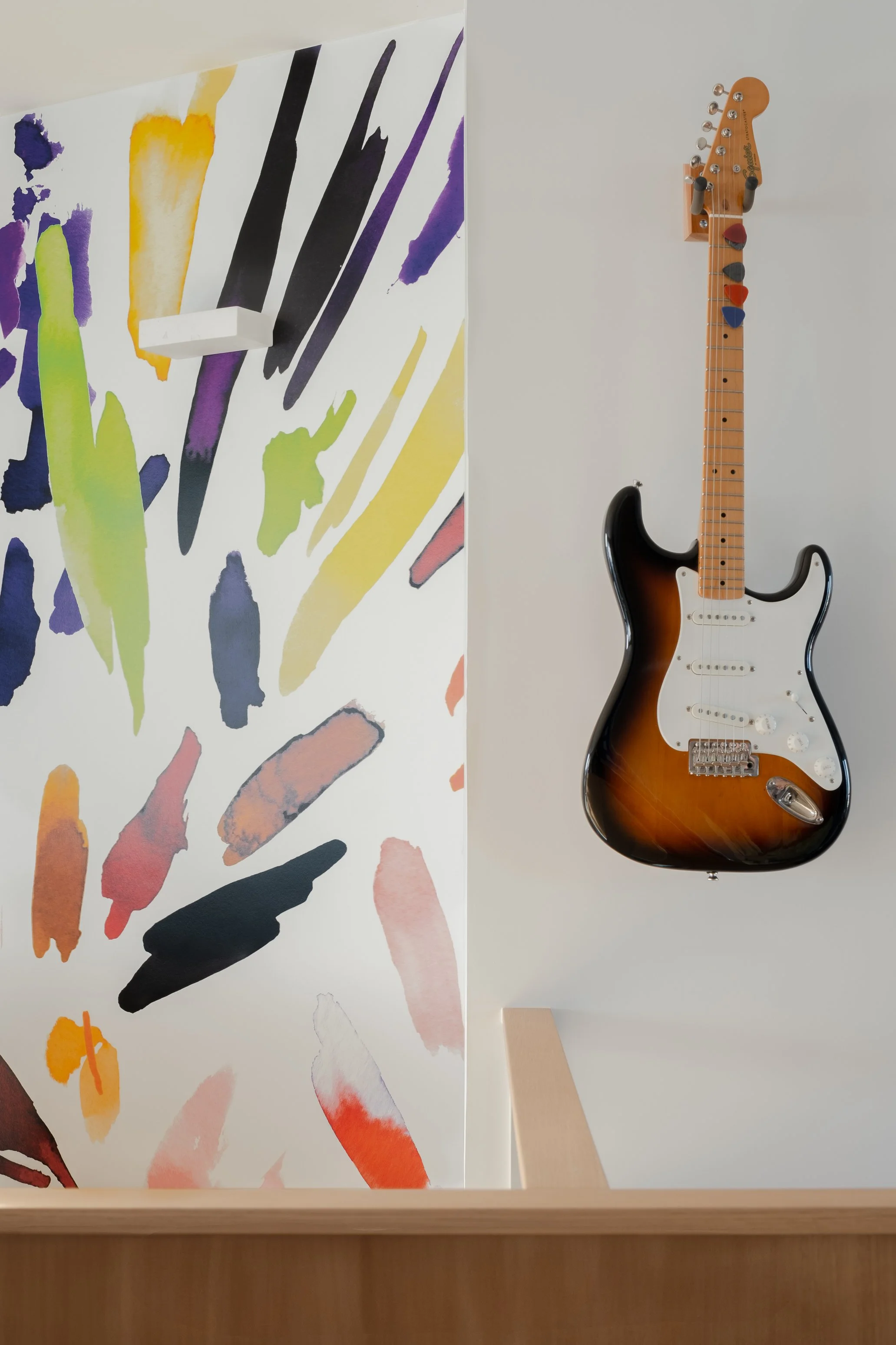Notre client et ses enfants vivaient déjà dans cet appartement construit en 2000, en triplex avec des vues très urbaines. Ce passionné de musique urbaines, de rock et de rap, sportif, moderne et profondément citadin voulait donnait de la personnalité à son chez lui pour qu’il lui ressemble.