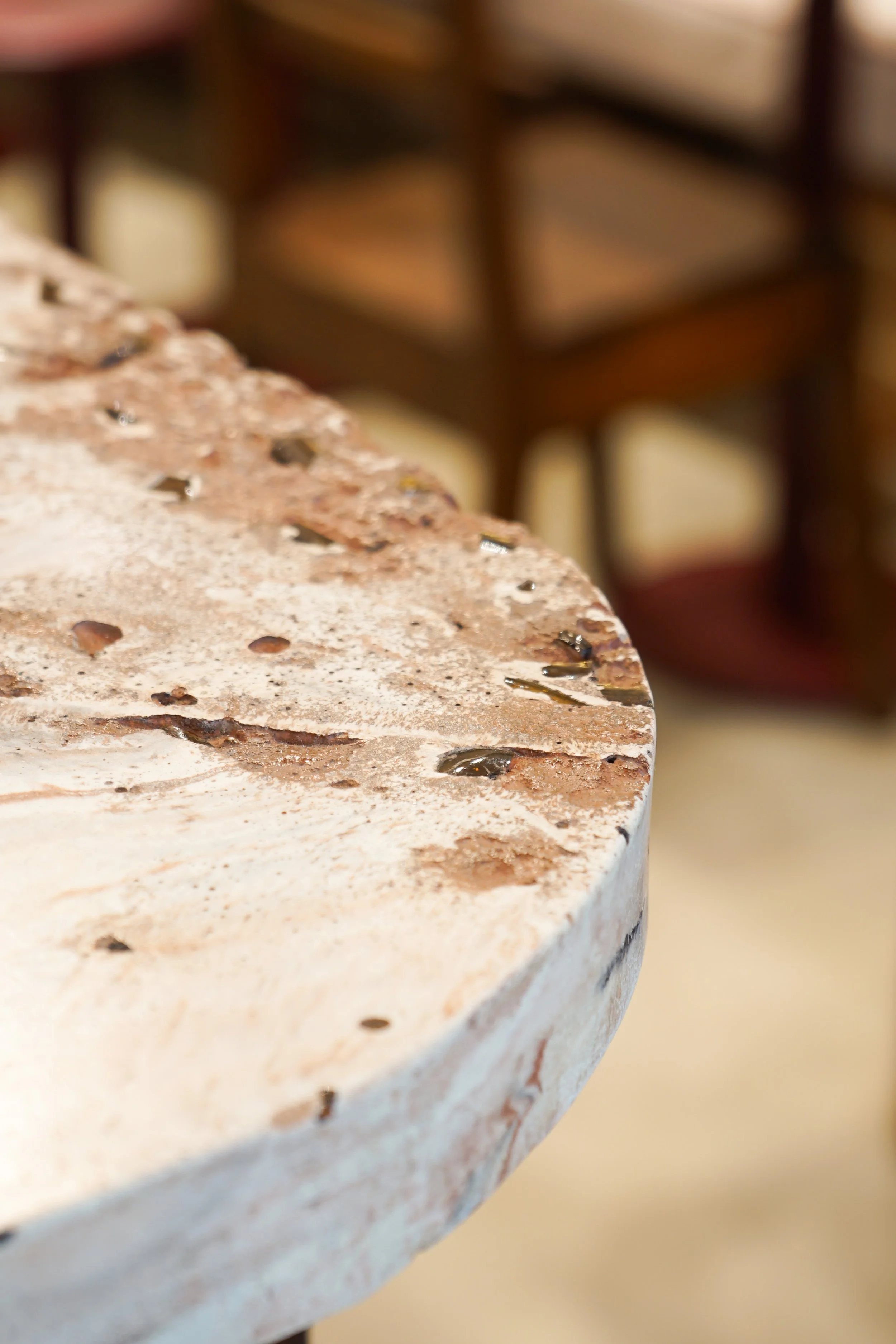 L’identité visuelle était la joie, le cool, le simple. La carte étant sourcée avec de bons produits, nous avons crée un espace à cette image : matériaux bruts et sains où les habitants du quartier et les générations se rencontrent. Tables en coquillage recyclés, briques brutes, bois, et plan de bar marbré en pierre écologique, pièces chinées et pièces de designer se rencontrent.
